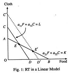 If more labour is not used with capital, the productivity of labour is bound to fall. As a result, there will be shortage of labour in the labour-intensive sector (food). And the end result is a fall in the output of food. Thus capital accumulation will lead to a fall in output of the labour-intensive industry. The RT can be presented in two types of models – a linear model and a non-linear model. In Fig. 1, we show the RT in a linear model.