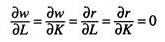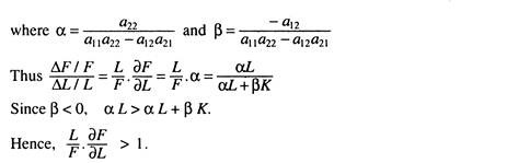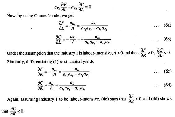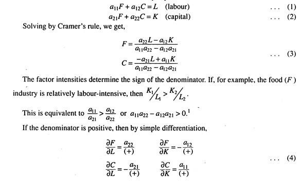 Here we have assumed linear homogeneity of the production function to express the < s as function of the factor price ratio (w/r) only. If now either labour or capital changes, the aij s remain constant, since [∂aij/∂ (w/r)]. [∂ (w/r)/dL]=0 and since the [(∂w/r)/∂L] = 0 from (2).