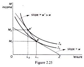 The individual’s equilibrium is determined by the point of tangency of his income- leisure line with the highest possible trade-off curve (point e in figure 2.25). Given the wage rate w, the individual maximizes his utility by working L1Z hours, earning income 0M1, and using the remaining time (0L1) for leisure.