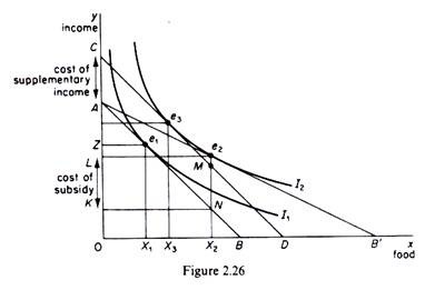 Comparing the two alternative policies we observe that both policies achieve the government’s goal of enabling the pensioner to reach the higher welfare state implied by I2. But the food subsidy programme is more costly (in our example) than the supplementary income policy. In fact if the government were to give to the pensioner the cost of the subsidy in the form of supplementary income, the pensioner would attain a higher level of satisfaction (an indifference curve above I2). However, the consumption of food will be greater in the case of the food subsidy policy.