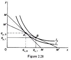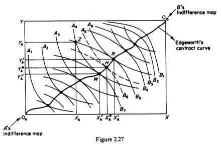 For example, the further down an indifference curve of B lies, the greater is the satisfaction. The two sets of indifference curves, being of opposite curvature, have points of tangency which form the so-called Edge-worth’s contract curve (0A0B in figure 2.27).