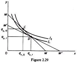 In figure 2.29 the equilibrium of the consumer in the base period is defined by C. Although basket D (including qx, t and qy,t) was on his original budget line, the consumer did not choose it, because it was lying on the lower indifference curve I1.