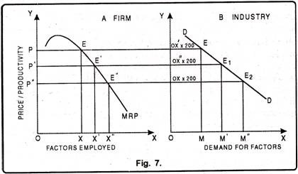 It means that the total demand of a factor unit at OP price level is OM i.e. OX’ x 200. Further, at price level OP’, the demand is OM’ = (OX” X 200) and so on. Now, by taking all the possible combinations of factors price and the total demand for it we can draw the demand curve DD for the whole industry. In Figure, the factor price is determined by the quantity of the factor, possibility of substitutes, and elasticity of demand for final product. Thus, the demand for the factor is determined by its marginal revenue productivity.