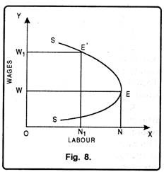 In Fig. 8 SS is backward sloping supply curve of labour. It shows that up to OW wage rate supply of labourer is increasing but when wage rate rises from OW to OW] then supply of labour decreases from ON to ON1,