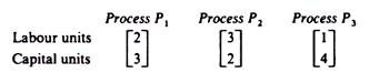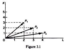 Activities may be presented graphically by the length of lines from the origin to the point determined by the labour and capital inputs. The three processes above are shown in figure 3.1. A method of production A is technically efficient relative to any other method B, if A uses less of at least one factor and no more from the other factors as compared with B.