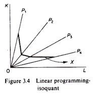 This assumes limited substitutability of K and L. There are only a few processes for producing any one commodity. Substitutability of the factors is possible only at the kinks (figure 3.4). This form is also called ‘activity analysis-iso- quant’ or ‘linear-programming isoquant’, because it is basically used in linear programming.