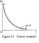 This form assumes continuous substitutability of K and L only over a certain range, beyond which factors cannot substitute each other. The isoquant appears as a smooth curve convex to the origin (figure 3.5). It should be noted that the kinked isoquants are more realistic. Engineers, managers, and production executives consider the production processes as discrete rather than in a continuous array. However, traditional economic theory has mostly adopted the continuous isoquants, because they are mathematically simpler to handle by the simple rules of calculus.