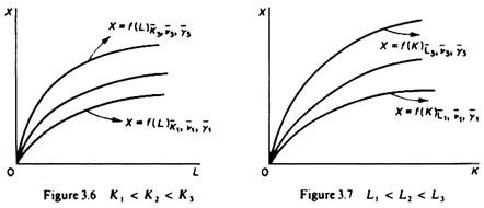 In figure 3.7 each curve shows the relation between X and K for given L, v and y. As capital increases, ceteris paribus, output increases: we move along the curve. If L (and/or v, and/or y) increase the production function X = ƒ (K) shifts upwards.
