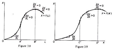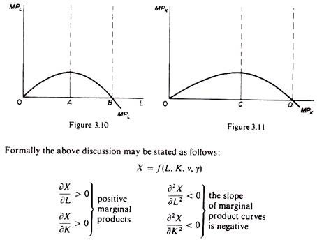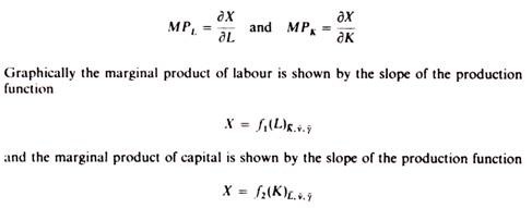 The slopes of the curves in figures 3.6 and 3.7 are the marginal products of the factors of production. The marginal product of a factor is defined as the change in output resulting from a (very small) change of this factor, keeping all other factors constant. Mathematically the marginal product of each factor is the partial derivative of the production function with respect to this factor. Thus