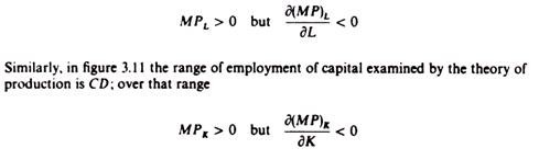 Alternatively we may say that the theory of production concentrates on levels of employment of the factors over which their marginal products are positive but decrease: in figure 3.10 the range of employment of L examined by the theory of production is AB; over that range