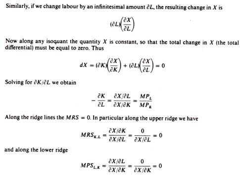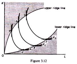 The upper ridge line implies that the MP of capital is zero. The lower ridge line implies that the MP of labour is zero. Production techniques are only (technically) efficient inside the ridge lines. Outside the ridge lines the marginal products of factors are negative and the methods of production are inefficient, since they require more quantity of both factors for producing a given level of output.