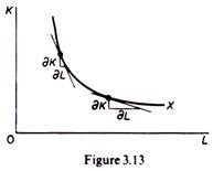 The slope of a curve is the slope of the tangent at any point of the curve. The slope of the tangent is defined by the total differential. In the case of the isoquant the total differential is the total change in X resulting from small changes in both factors K and L. Clearly if we change K by K, the output X will change by the product