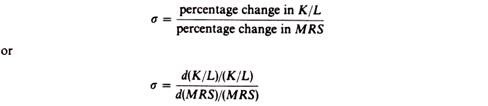 The marginal rate of substitution as a measure of the degree of substitutability of factors has a serious defect: it depends on the units of measurement of the factors. A better measure of the ease of factor substitution is provided by the elasticity of substitution. The elasticity of substitution is defined as the percentage change in the capital labour ratio, divided by the percentage change in the rate of technical substitution