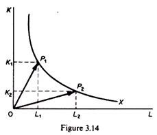 The factor intensity of any process is measured by the slope of the line through the origin representing the particular process. Thus the factor intensity is the capital-labour ratio. In figure 3.14 process P1 is more capital intensive than process P2. Clearly