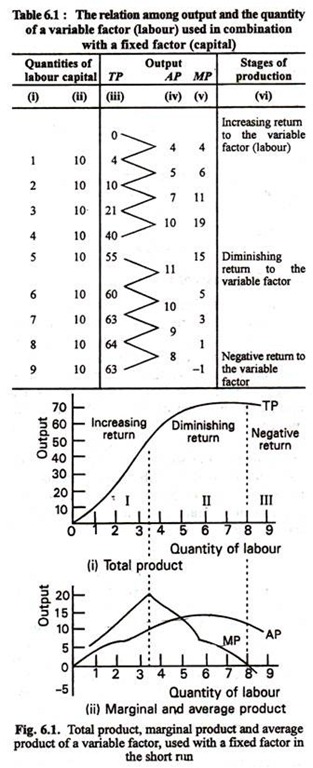 The data presented in Table 6.1 are shown graphically in Fig. 6.1. In Table 6.1 we show the total product that results from employing 1 to 9 units of labour [Column (i)] in combination with a fixed quantity (10 units), of capital, [column (ii)]. Column (iv) shows the corresponding AP figures. Each figure of column (iv) is arrived at by dividing each element of Column (iii) by the corresponding element of Column (i). Column (v) gives the MP figures.