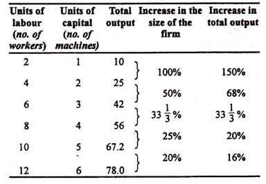 Table 6.2 shows that the firm increases its size but the proportion between the factors remains unchanged (i.e., 1 unit of capital per 2 units of labour). As the size of the firm increases from 2 workers and 1 machine to 6 workers and 3 machines, it experiences increasing returns to scale (output increase more than proportionately).