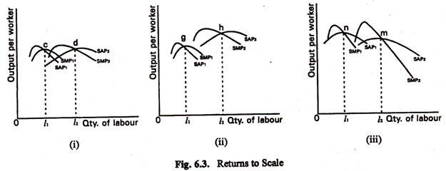 In Fig. 6.3(i) it is clear that the production process exhibits constant returns to scale. Suppose the firm is operating at point c or SAP1, at which average product is at a maximum, i.e., the quantity of labour is L1 and output per worker, on an average, is L1c.
