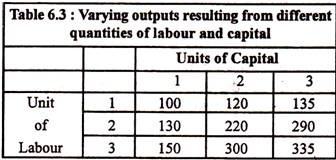 Table 6.3: Varying outputs resulting from different quantities of labour and capital