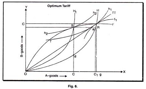 The following figure 6 explains the existence of some optimum tariff level. (R) is free trade equilibrium. At that point the volume of trade is og of A-good and oc of the B-good, and the terms of trade are given by the slope of line TP. The home country (II) now wishes to impose a tariff that will maximize its community welfare, i.e. place it on the highest possible trade indifference curve assuming no retaliation on the part of the foreign, country. Under free trade conditions at (R) country (H) attains the trade indifference level (h1) which crosses the foreign offer curve (OF) at (R) and at some other point (T).