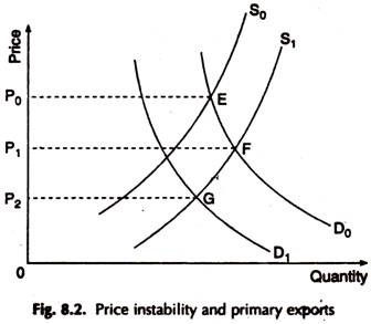 Thus, price inelastic and unstable D and S curves may lead to sharp price fluctuations. Here the range of price fluctuations is fairly wide P0-P2. Thus inelastic (i.e., steeply inclined) and unstable (i.e., shifting) demand and supply curves for the primary exports of developing countries can lead to large fluctuations in the prices of the exportable products of developing countries.